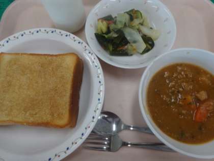 今日はセサミトースト、ハンガリアンシチュー、わかめサラダでした。