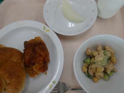 今日は魚のフライマッシュルームソース、ビーンズサラダ、梨でした。