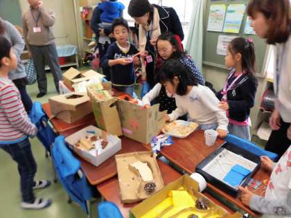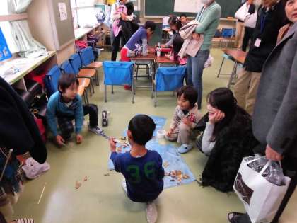 14日土曜授業の日の1・2時間目、秋のものを使って、自分たちでいろいろなものを作って「お店屋さん」を開きました。松ぼっくりの手作りツリーやドングリのコマ、落ち葉でネックレスやつり堀り遊び、子どもたちは、お客さん役とお店の人、保護者の方はお客さんになってもらい、楽しい時間を過ごすことができました。