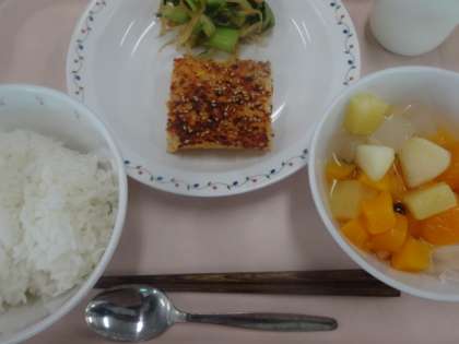 今日は松風焼き、菊花おひたし、フルーツみつ豆でした。みつ豆はお豆がきらい、寒天を食べたことがない。などなどいろいろな話が出てきました。
