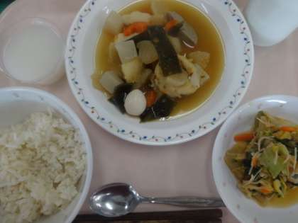 今日は茶飯、おでん、キノコ入りにびたし、ホワイトゼリーでした。おでんの具材での好ききらいが話題になりました。