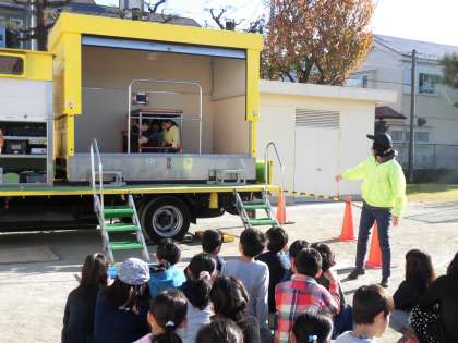 4年生は、1・2時間目「なまず号」で地震体験をしました。実際に震度7まで体験した子どもたちは、突然大きな地震がおきた時に。「頭を守る」「姿勢は正座」など、どうのように行動すべきかについて学びました。
