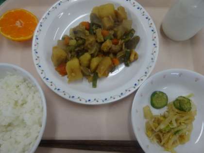 今日はいりどり煮、ごま酢あえ、花みかんでした。和食のメニューでしたが、よく食べていて、4年生は足りないぐらいだったそうです。