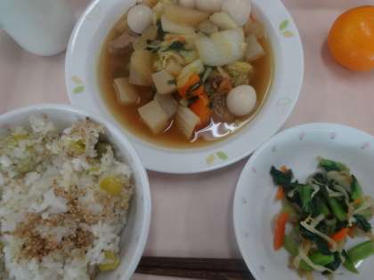 今日はさつまいもごはん、豚肉と大根のうま煮、おひたし、みかんでした。よく食べていましたが、低学年の担任の先生から「うま煮の野菜の大きさははしがまだ上手に使えない低学年では食べるのに時間がかかりおかわりまでいく時間がない」というお話をいただき「なるほど」と課題を一ついただいた思いでした。