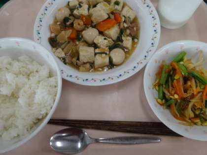 今日は豆腐の五目いため、三色ナムルでした。どのクラスもよく食べていて、残食も少なかったです。