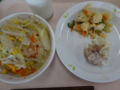 今日は札幌ラーメン、ジャンボシュウマイ、カリフラワーの中華和えでした。 ラーメンは4年生が切望していためにゅーで、とても楽しみにしていたようです。麺がくっついてしまい配膳に手間取ってしまいましたが、とてもよく食べてくれていました。