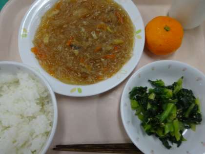 麻婆春雨は少し食べにくい形でしたが、低学年でも箸を使って上手に食べていました。 中華和えは今が旬の「タアサイ」という中国野菜を使って作りました。くせがなくとても食べやすかったです。