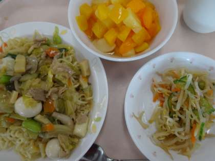 今日はいためそば五目あんかけ、塩ナムル、フルーツカクテルでした。麺はどのクラスも人気があり、よく食べていました。どの献立も残食もほとんどなくよく食べていました。