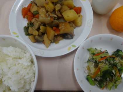今日は七味煮、青菜のショウガ醤油和え、ぽんかんでした。七味煮はぴりりと一味唐辛子の辛みが食欲をそそる感じでしたが、低学年で辛みが苦手な児童は「これ辛い!」といいながらごはんをしっかり食べていました。