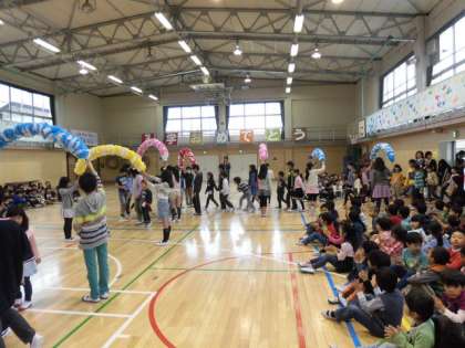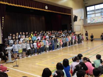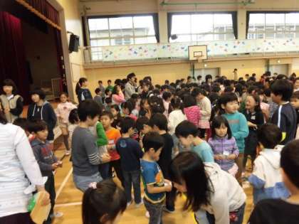 先週の水曜日、6日に入学した1年生も6年生からいろいろ教えてもらいながら、元気に学校生活を始めました。今日は、体育館で1年生を迎える会を行いました。昨年度の代表委員の人たちがクイズやゲーム、司会などの準備をしっかりとしてくれ、みんなで楽しいひと時を過ごしました。名刺交換ゲームでは、1年生も自分で書いた名刺を交換しながら、ほかの学年の人とも交流しました。1年生もみんなで元気に歌を歌いました。1年生を迎える会が終わって、1年生の外遊びも始まりました。早く学校生活に慣れて楽しく過ごしてください。