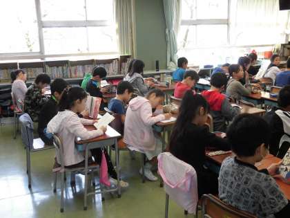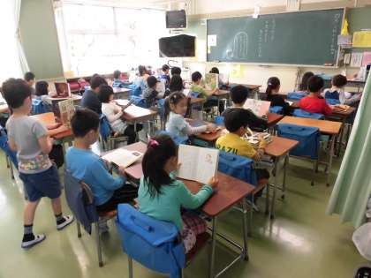 朝遊びの後は、読書タイムです。チャイムの合図ですぐに教室に戻り、席で静かに読書を始められる子どもたちがたくさんいて素晴らしいです。週3回の読書タイムでたくさんの本に親しみましょう。