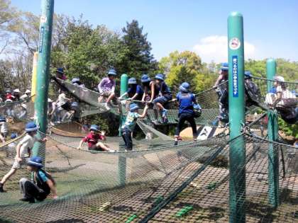 子どもの森に到着。34年生のグループで遊びます。ほかの学校の人もたくさんいます。協力して仲よく遊びましょう。