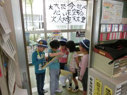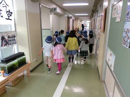2年生が準備と練習をしてきた1年生校内めぐり。今日本番でした。2年生が1年生の手をつなぎ、グループで校内を回りました。2年生の説明を一生懸命1年生が耳を傾けていました。