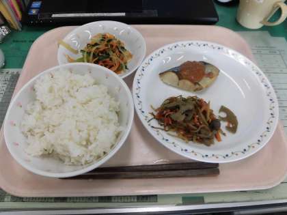 今日の給食は、麦ご飯・魚のピリからソースかけ・からしあえ・五目きんぴらです。