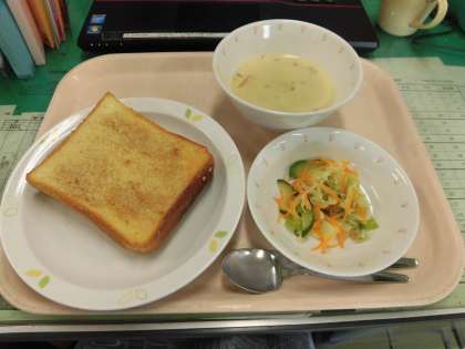 今日の給食は、セサミトースト・コーンシチュー・フレンチサラダです。