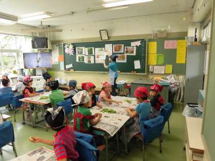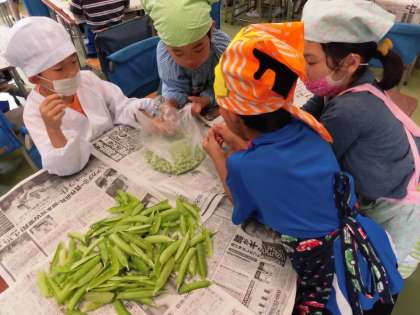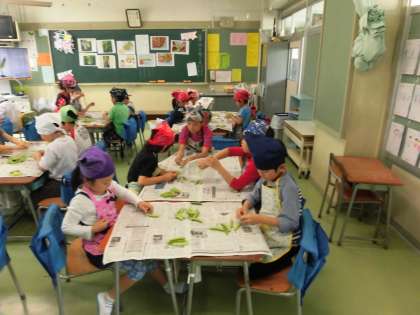 2年生が、グリーンピースのさやむきに挑戦。栄養士の先生からお話を聞いた後、みんなで協力しさやをむきました。さやの中からは、たくさんのグリンピースがあらわれました。今日の給食で食べるのが楽しみです。
