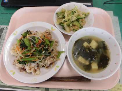 今日の給食は、ビビンバ・わかめスープ・野菜の中華風味です。