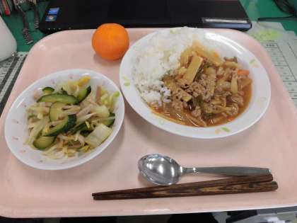 今日の給食は、スタミナどん・白菜のちゅうかサラダ・冷とうミカンです。