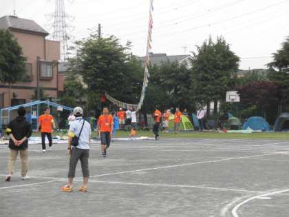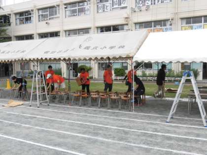運動会の最後の準備をしています。おやじの会のみなさんが、オレンジ色の揃いのTシャツで子供たちのために手伝ってくれています。ありがとうございます。
