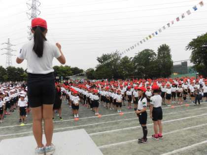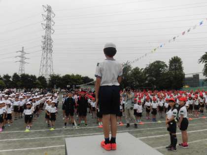1年生の開会の言葉で始まった運動会、6年生の誓いの言葉も立派でした。運動会の歌を元気に歌って運動会が始まりました。