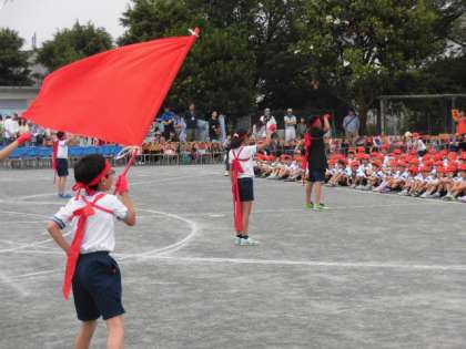 はじめの運動をして、応援合戦です。赤も白も応援団長を中心に頑張って運動会を盛り上げました。ありがとう。