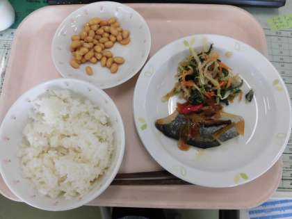 今日の給食は、ごはん・さわらのあまずあんかけ・やさいのあまずあんかけ・ぶどうまめです。