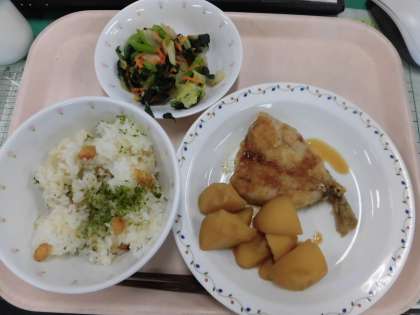 今日の給食は、豆ご飯・魚の南ばんあげ・やさいのおかかかけ・じゃがいものあまからにです。