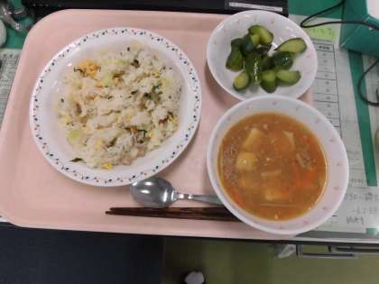 今日の給食は、青菜のチャーハン・マーボしる・きゅうりのあまずかけ です。