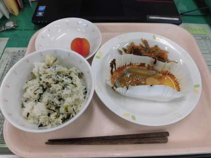 今日の給食は、菜めし・魚のみそマヨネーズ焼き・きんぴらゴボウ・プラムです。