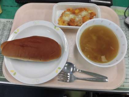 今日の給食は、黒砂糖パン ポテトグラタン いなか風スープです。