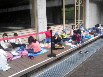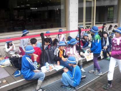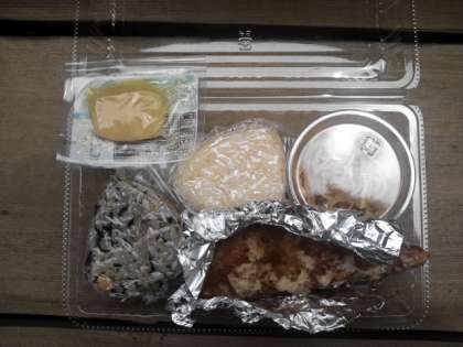 ハイキング、ゴールした班からお弁当を食べています。お弁当は、おにぎり、白身魚の竜田揚げ、たくあん漬、切り干し大根煮、オレンジジュースです。たくさん歩いてお腹もすきました。いただきます。
