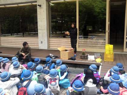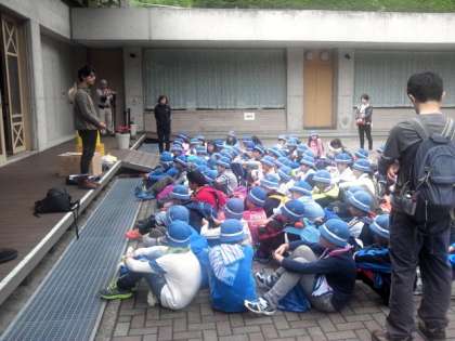天気もよくなり、午後はマスつかみとコースターづくりを学級ごとに分かれて行います。全体で説明を聞いてからはじめます。