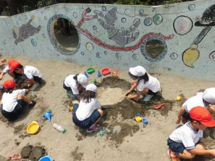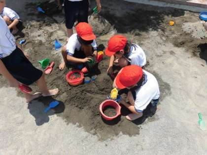 1年生が砂場遊びをしました。砂を掘ったり、山を作ったり、水を流して川や湖を作ったり、グループで協力して楽しく活動しました。