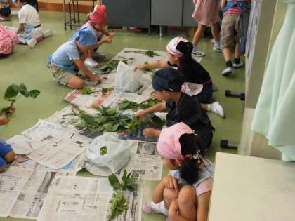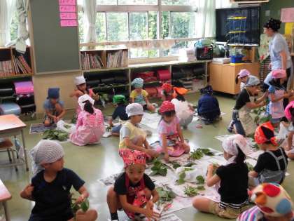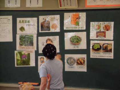 給食で食べる枝豆のさやを枝からもぐ作業に一年生が挑戦しました。枝に着いた枝豆をひとつひとつ丁寧に取りました。取った枝豆は給食室でゆでて給食で食べました。自分たちでもいだ枝豆はとてもおいしかったです。