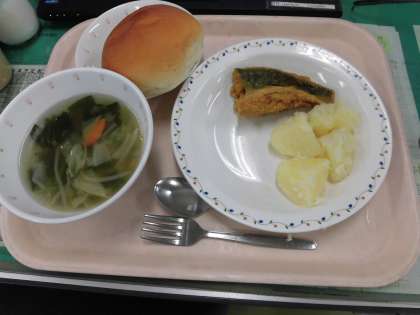 今日の給食食材は、ミルクパン 魚のカレーあげ こふきいも ベーコンと野菜のスープ