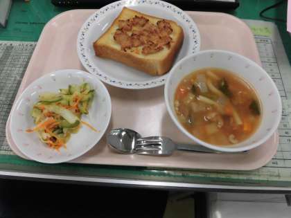 今日の給食は、ツナトースト 野菜のイタリアンドレッシングかけ ミネストローネです。