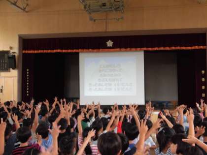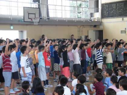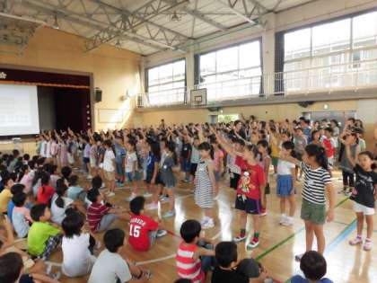 1学期最後の音楽集会は「虹」を歌いました。体育館にみんなの声と手話が広がると、みんなの思いが通じたのか曇っていた空が明るくなってきました。