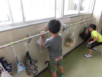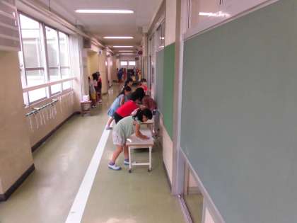 始業式の後は、大掃除です。教室の中はもちろん、廊下の壁も給食の配膳台も協力して、ピカピカにしています。気持ちよく夏休みを迎えられます。