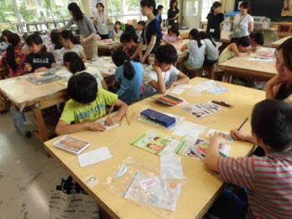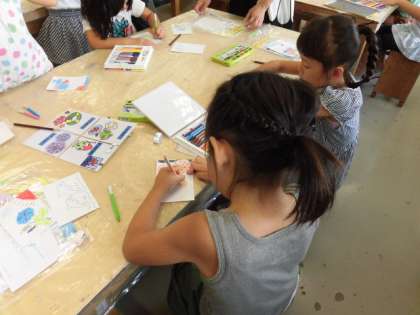 夏休み地域教室、二日目です。「絵手紙」では、はがきのあて名の書き方を学んで、色を塗ってきれいな絵手紙を完成させました。誰に送るのかな?