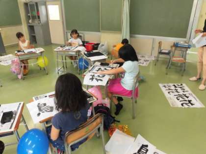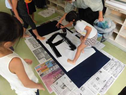 「初めての習字」の2回目です。今日参加した子どもたちは、最後に大きな筆で「月」と「火」を元気よく完成させました。
