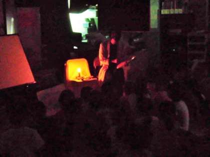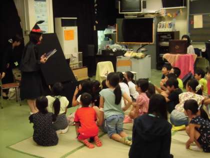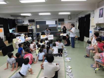 音楽室では、「お話の世界」が開かれました。読み聞かせ有志のお母さんたちが、工夫を凝らして楽しい夏にちなんだお話を聞かせてくれました。暗いお部屋は少し怖かったかな?