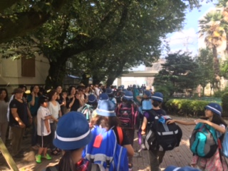 良い天気に恵まれて日光林間学園が始まります。出発式をして元気に出かけます。お見送りありがとうございます。