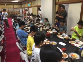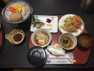 宿舎でいただく最初の食事です。メニューは、ごはん、わかめの味噌汁、和風ハンバーグ、鶏のからあげ、スパゲティナポリタン、白身魚西京焼き、みかん牛乳カン、ゆばの佃煮、日光湯波、玉子豆腐です。美味しくいただきます。