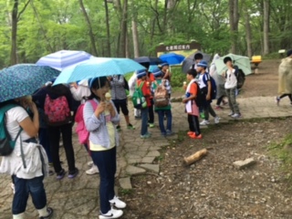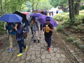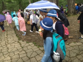 お弁当の途中で雨が降り出しました。かさをさして、並んでソフトクリームをいただきます。