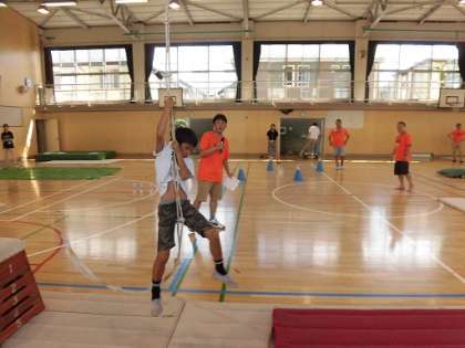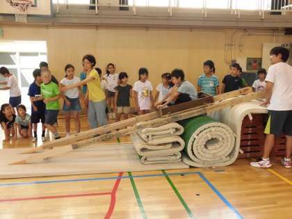 夏休み地域教室、最後の教室「MUSASHI」を体育館で行いました。昨日からおやじの会の人たちが準備をしてくれました。今年で8回目の「MUSASHI」です。前半は3・4年生が記録に挑戦。最後まであきらめずに取り組みました。認定証と順位の良かった人はメダルももらいました。