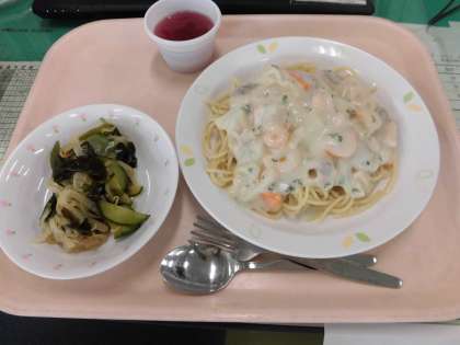 今日の給食は、スパゲティクリームソース・じゃこサラダ・ブドウゼリーです。