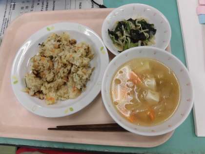 今日の給食は、とり肉とごぼうのご飯・豆腐じる・和風サラダ です。
