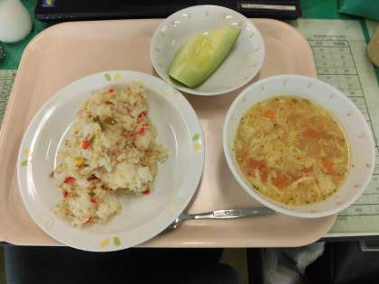 今日の給食は、ナシゴレン・トマトと卵のスープ・メロン です。