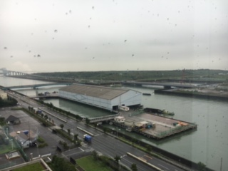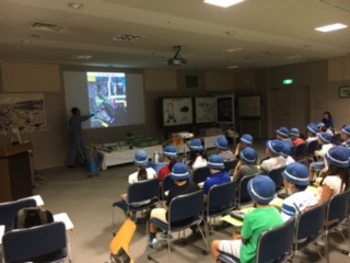 中央防波堤埋立処分場に到着。係のひとから、処分場について説明を聞いています。