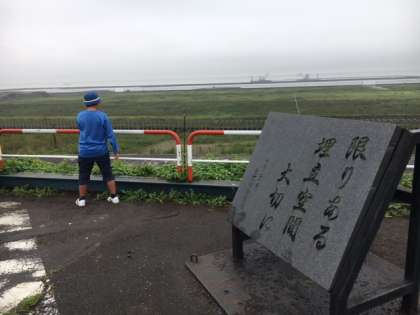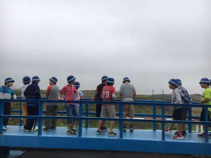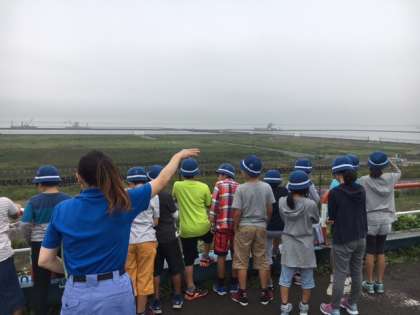 バスを降りて、埋立処分場の一番高い見晴らし場から見学しています。残り少ない処分場です。みんなで「ゴミを減らすぞ」と大きな声で宣言しました。